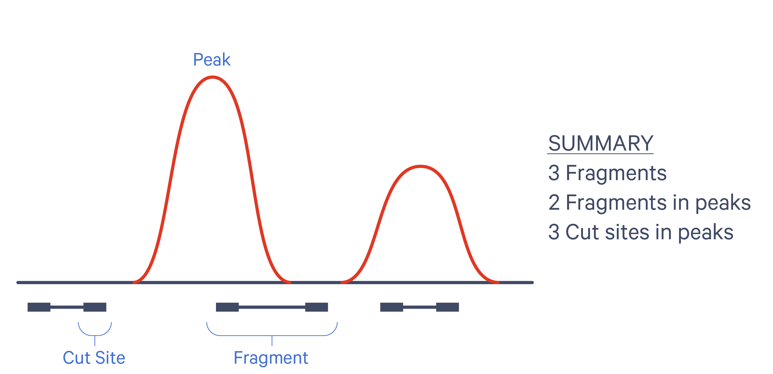 The relationship between cut sites, fragments, and peaks is shown in the following diagram: